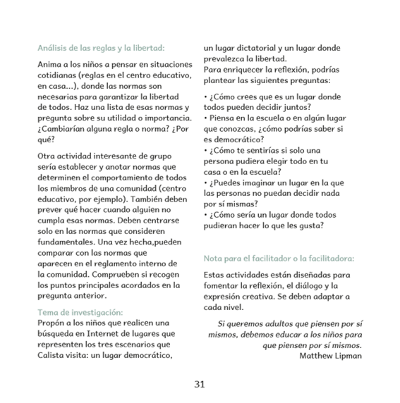 “Calista. El misterio de la verdad” y “Calista. El misterio del yo y de la libertad“ no son un relato más en la estantería; son una invitación a embarcarse en un diálogo entre niños, niñas, familias y educadores. Estas obras van acompañadas de una guía práctica para fomentar el diálogo filosófico, ofreciendo recursos y propuestas que facilitan la reflexión compartida y el pensamiento crítico. Una experiencia filosófica diseñada para dejar una huella en las mentes y corazones de los más jóvenes, alentándolos a descubrir y afirmar su sentido de identidad y autonomía.