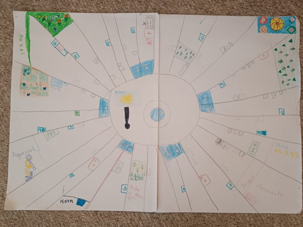 En el mapa que diseñaron, Sol se organiza en sectores radiales que parten de una plaza central, donde se encuentra la bandera y la fuente de la ciudad como símbolo de comunidad y energía. Cada sector alberga espacios esenciales como viviendas, hospitales, el aeropuerto, hoteles, parques y una piscina gigante (Aquapark). También aparecen zonas verdes donde se refleja el deseo de convivir con la naturaleza y los animales.